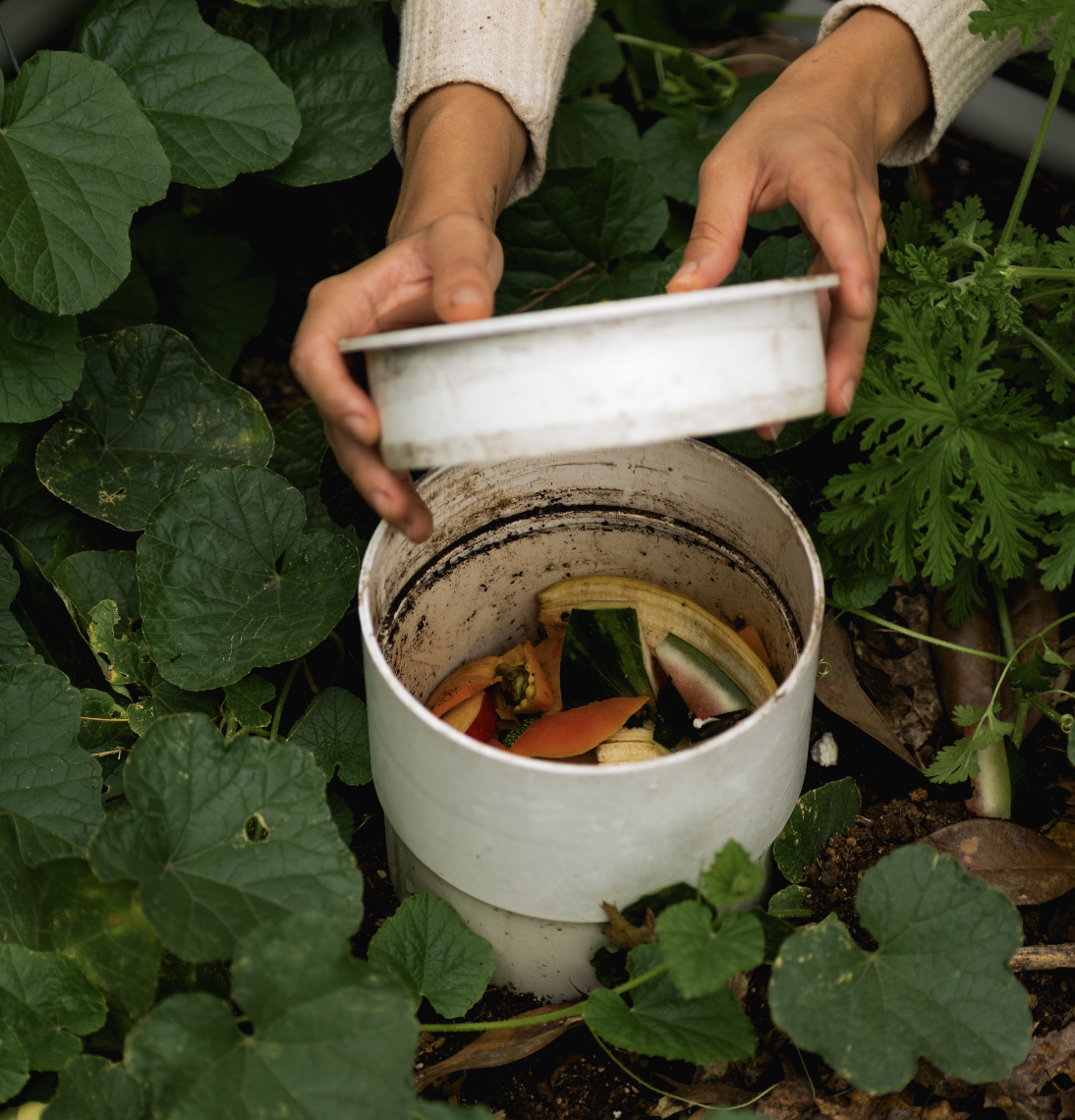 5. La cadena de nutrientes comienza en el compostaje de los desechos orgánicos de mi casa, el cual eventualmente se convierte en abono para las plantas del huerto.